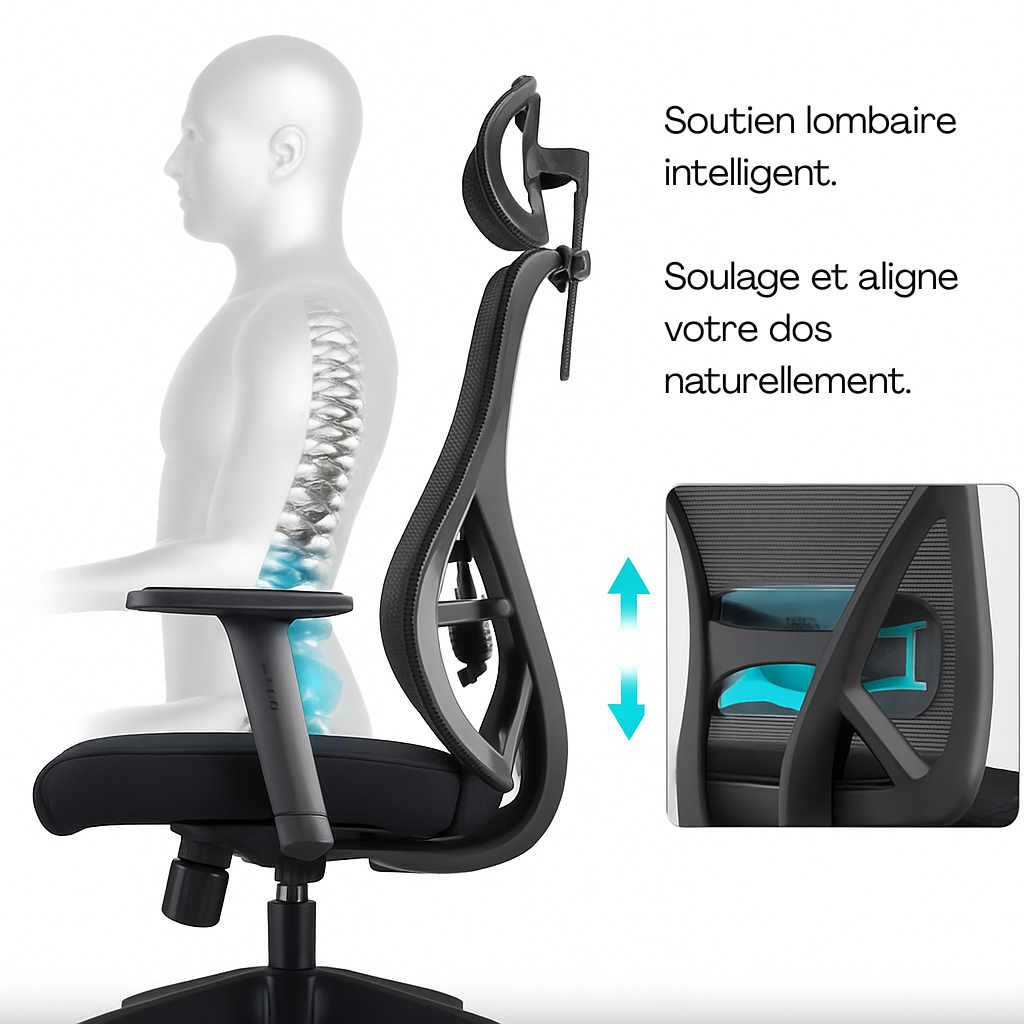 -Le soutien lombaire s’ajuste à ta taille pour un confort personnalisé, même après plusieurs heures de travail.